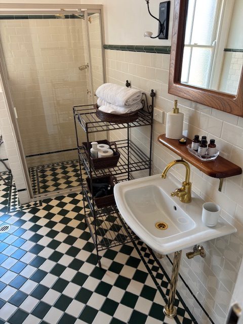 The bathroom echoes the opulence of a bygone era with beautifully laid green & white checkerboard floor tiles accompanied with the green accent wall tiles.