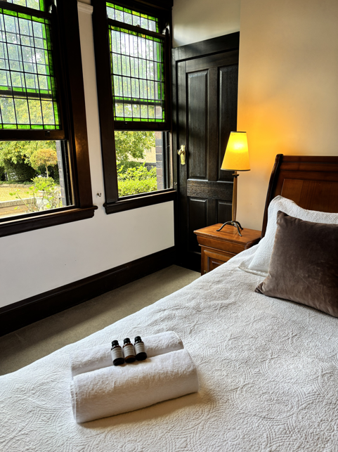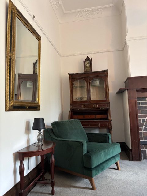 The green and gold motif in the Lalor Room provides a serene and regal sanctuary, steeped in vintage charm and quiet luxury, complemented by delicate gold accents that catch the light and add a subtle, glowing warmth to the space. The Lalor room blends seamlessly into the adjacent garden.