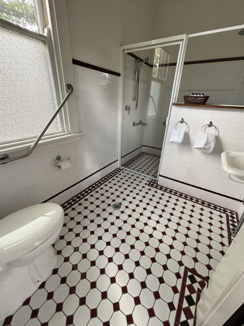 The bathroom echoes the opulence of a bygone era with beautifully laid green & burgundy checkerboard floor tiles accompanied with the green accent wall tiles.